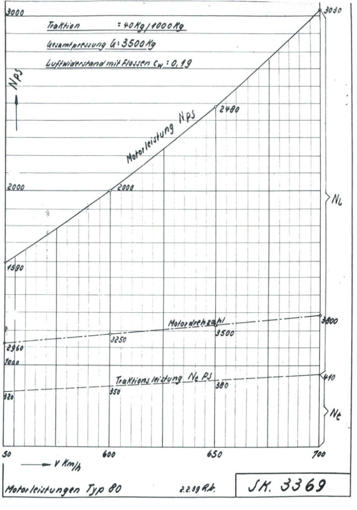 Rekordwagen Mercedes-Benz T 80. Grafik der Motorleistungs-Berechnung von 1939 (Bild: Daimler AG)